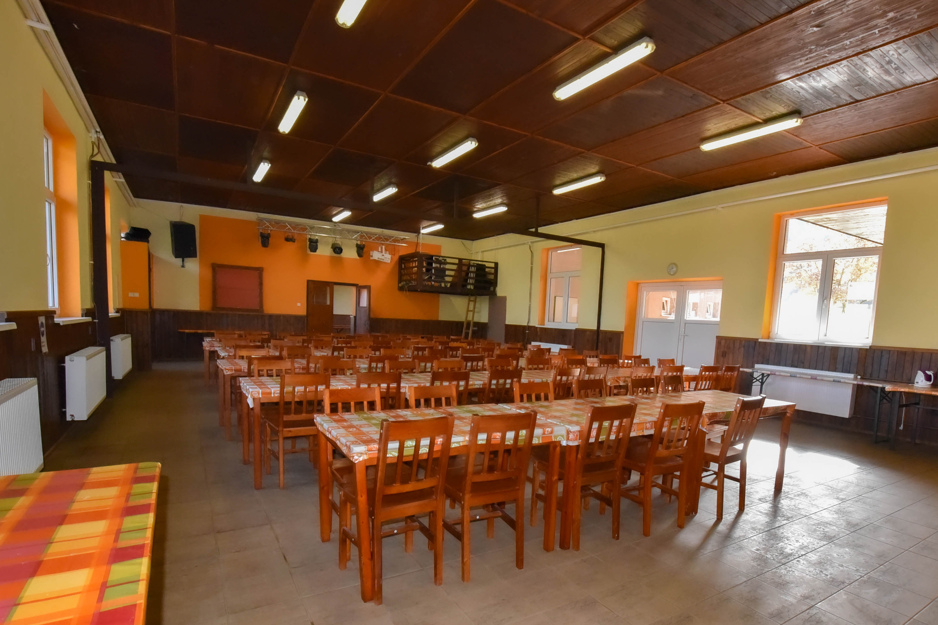 - V hlavní budově se nachází zázemí kuchyně, prostorná jídelna a dvě menší klubovny, které je možné využít jako učebny. V případě nepřízně počasí je možné využít již zmíněné vnitřní prostory, ale také party stan v horní části areálu či několik nových zastřešených pergol s posezením. Jídelna také disponuje moderní zvukovou technikou, kterou je rovněž možné využít.