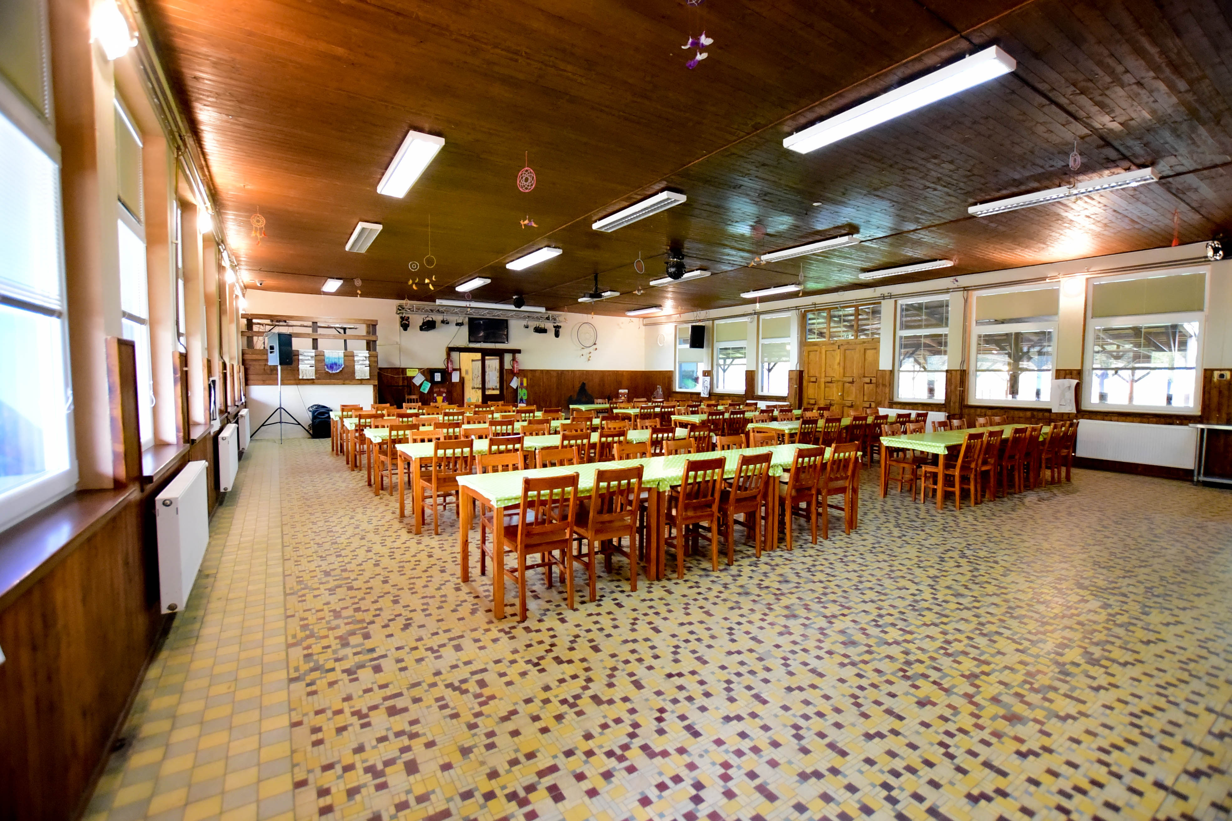 - V hlavní budově se nachází zázemí kuchyně, prostorná jídelna s moderní zvukovou technikou, vstupní vestibul, společné sociální zázemí, ale také několik kluboven využitelných jako učebny. V případně nepřízně počasí lze také využít party stany či zastřešené venkovní pergoly.