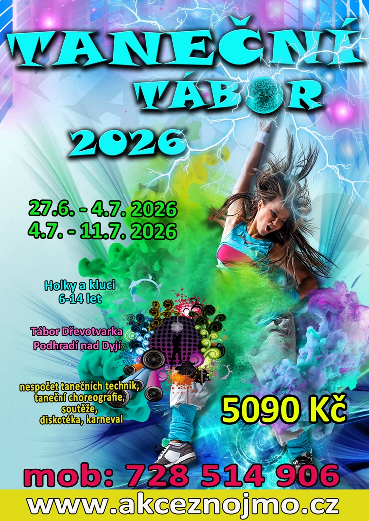 Taneční techniky – free style dance. Čekají Vás všechny aktivity, které k táboru patří: diskotéka, karneval, výlet na hrad, stezka odvahy, noční hry, slaňování, hry ve vodě, bahenní zápasy, pingpong, paintball, bubnování, výtvarné tvoření, míčové hry, lukostřelba, opékání buřtů atd. Program bude zpestřen paintballovým, výtvarným nebo bubnovacím táborem, který poběží souběžně s naším. Celý program tábora je po stránce taneční, pod vedením zkušené lektorky!