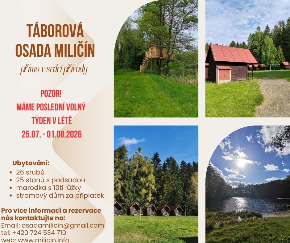 Nabízíme poslední volný týden v letním období a to od 25.07.-01.08.2026. Naše táborová osada je vhodná pro různé druhy akcí - od dětských táborů až po teambuildingové aktivity pro firmy. Více informací na našich stránkách: www.milicin.info.