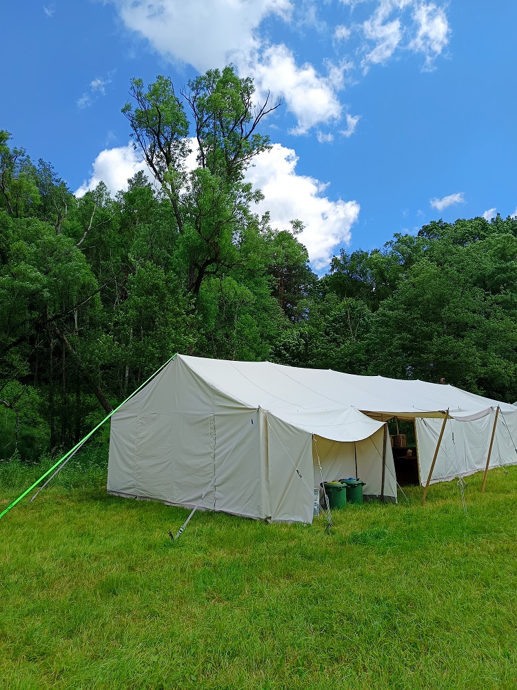 Táborový podsadový stan včetně podlážky, vnitřního vybavení a plachty.